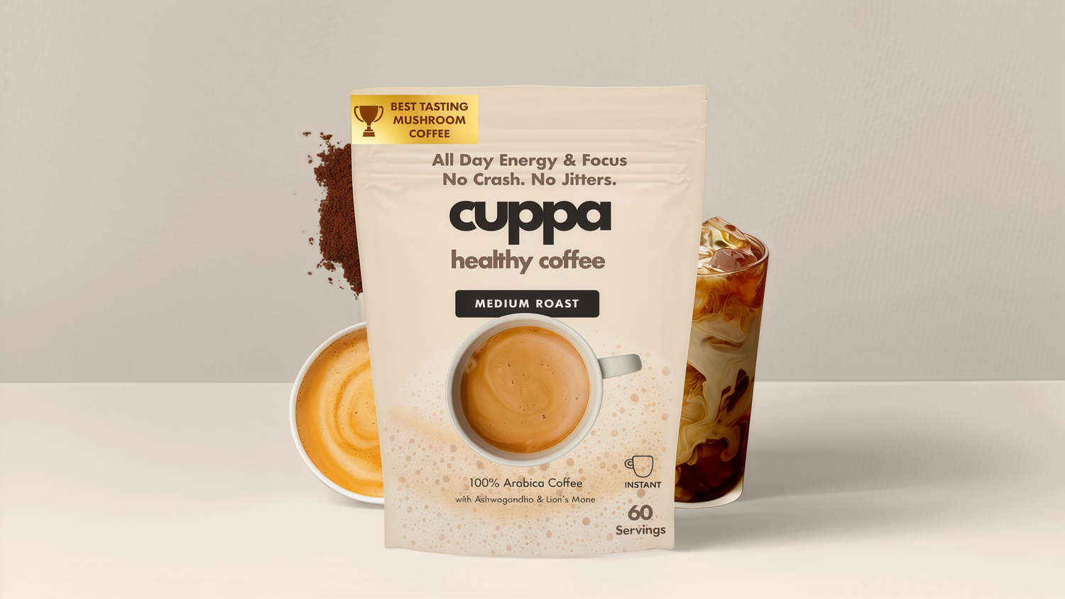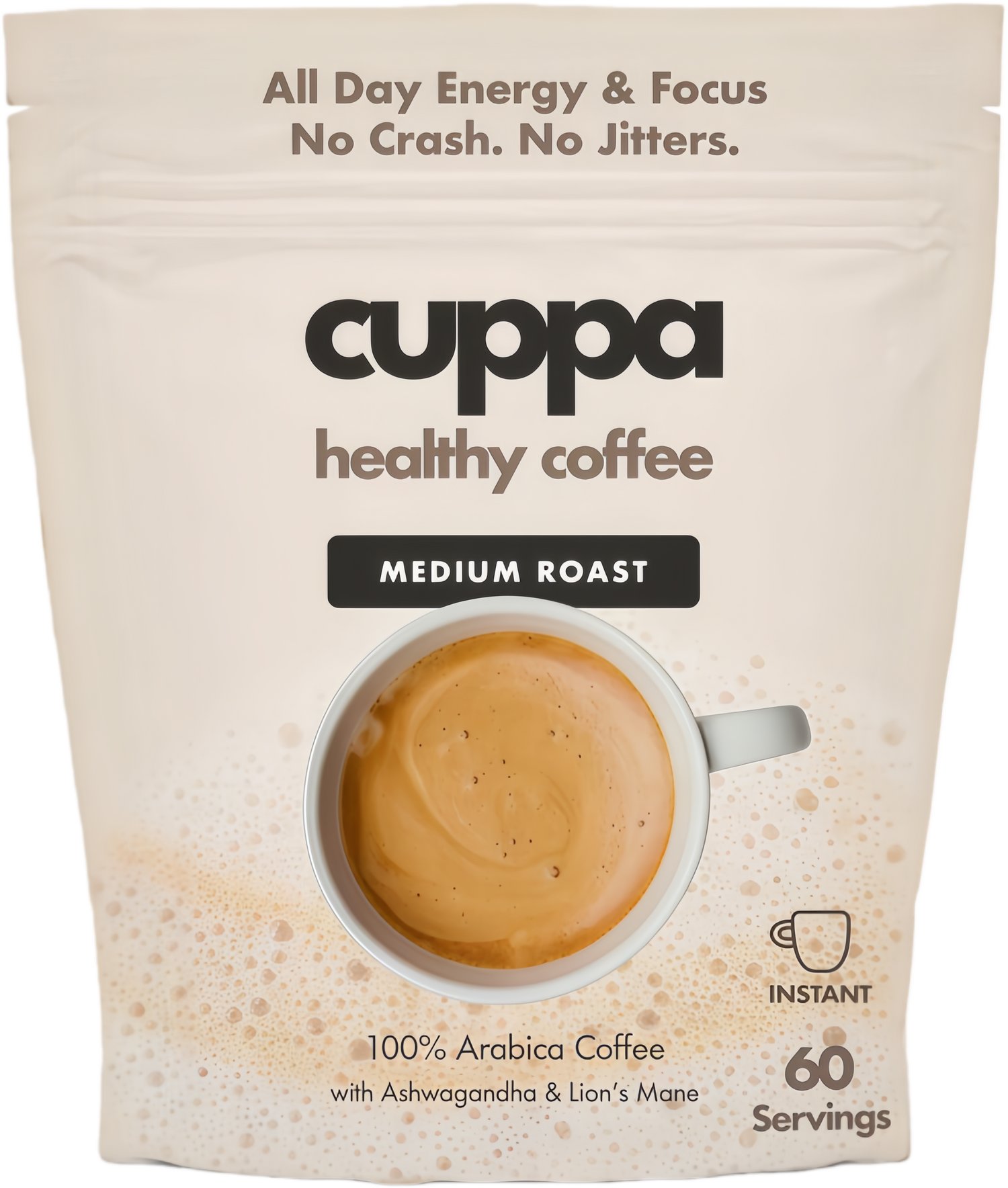 Each cuppa contains about 70mg of caffeine, which is up to 50% less than your regular cup of coffeewhich typically ranges from 100-140mg depending on roasting (ours is medium) and serving size.However, unlike your regular cup of coffee, cuppa adds L-Theanine, Ashwagandha and MCT to harnessthe power of caffeine to work for you, not against you. No jitters or crash, just stable, sustained energyall day. Oh and better sleep and mood too. You're welcome.